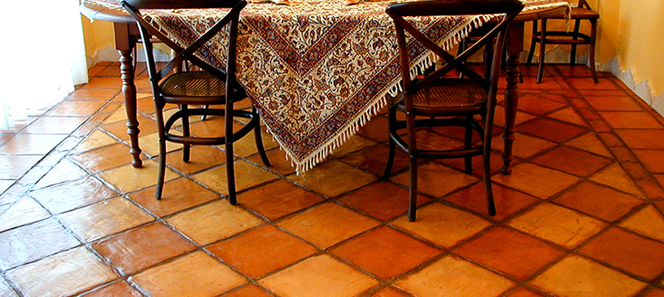 Este salón se decoró con baldosas de 30 × 30 x 2 cm. de barro cocido manual, procurando hacer una selección de barro de dos colores, terracota claro y rojo, para poder hacer una combinación de los dos para dar un carácter único al salón, se enmarcó el pavimento cerámicos, con una naveta de barro cocido, en forma de flecha para delimitar el espacio.