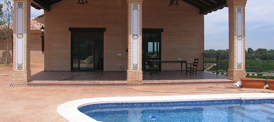 Terraza con piscina y paellero barbacoa, con suelos de barro de cerámica cocida en este proyecto se colocó diferentes tipos de baldosas de barro: remates de piscina con canto romo y esquinas, el suelo del porche con pavimentos de barro combinado con tacos de 8 × 8 en color blanco antiguo, azulejos de barro de 30 × 30 × 2,2 cm para los pasillos del jardín y al fondo espectacular paellero barbacoa con pilares de baldosas del barro tipo caravista, el borde del paellero, se realizó con peldaños de barro cocido como los que se colocan en las escaleras, con canto romo