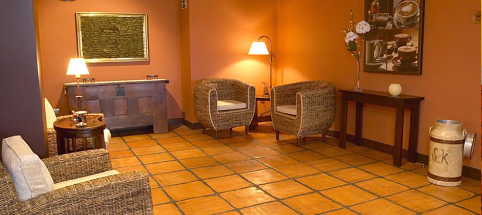 El recibidor de este hotel rural en Navarra, se colocó el suelo de barro cocido, de 40 × 40 × 2,8 cm. La colocación de los azulejos de barro, fue cuadriculada para no dar más protagonismo al espacio, teniendo en cuenta que es una sala de estancia corta.
