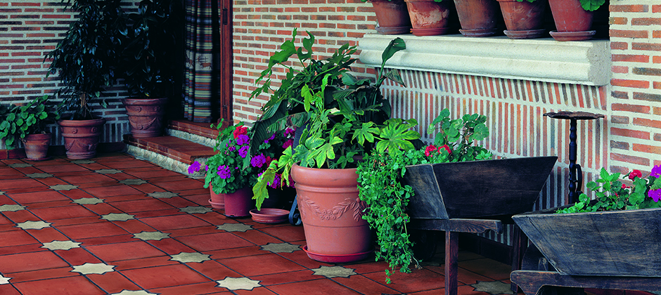 Suelos de cerámica compuesto por baldosas de barro manual de 20 × 20 × 2 cm. con Navada y estrella esmaltada en blanco. Este pequeño rincón de la entrada de la casa quedó elegantemente decorado gracias al suelo de cerámica de barro cocido y las baldosas de barro de caravista que se colocaron en la pared cuando se construyó la casa, el cliente que tiene mucho gusto y está siempre preocupado con los detalles hace de este rincón con barro cocido un espacio único y agradable.